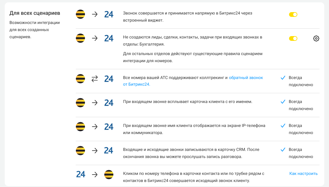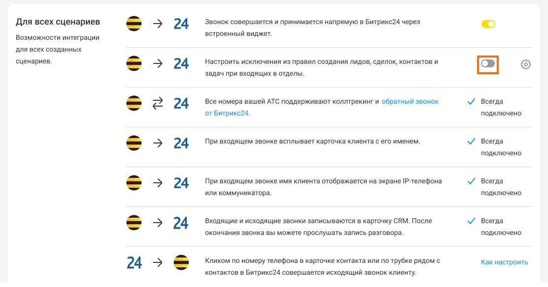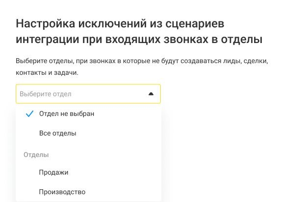 Если у вас настроен единый сценарий интеграции с Битрикс24 для всех номеров и при входящих в отделы создаются лиды, сделки, контакты и задачи, то вы можете настроить исключения из общего сценария для тех отделов, которые не пользуются CRM. Например, сделать так, чтобы при звонке на внутренний номер бухгалтерии никаких новых сущностей в CRM не создавалось. Далее мы расскажем, как это сделать.