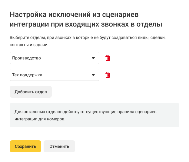 Откроется окно, в котором вы можете настроить исключения из сценариев интеграции при входящих звонках в отделы.
