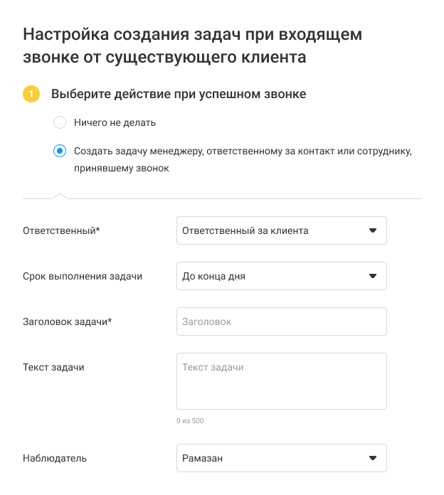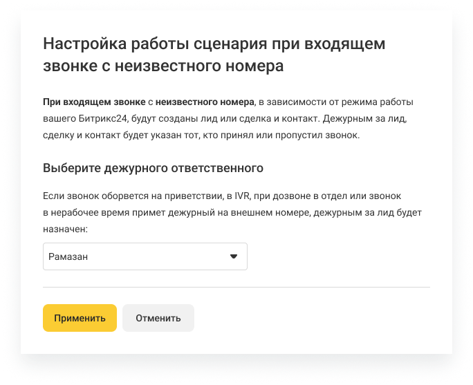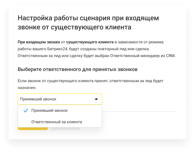Например, если звонок поступил от существующего клиента, то ответственным за лид может быть назначен сотрудник, принявший звонок, либо ответственный за контакт.
