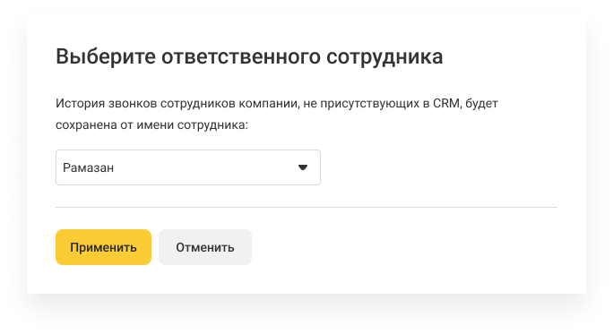 История звонков ваших сотрудников, не присутствующих в Битрикс24, будет сохранена от имени выбранного пользователя. Этой опцией можно пользоваться, если вы не сопоставили всех менеджеров или если у вас есть сотрудники, которые не работают в Битрикс24, но могут звонить клиентам (бухгалтер, курьер и т.п.). Для таких звонков не будут созданы контакты, сделки и лиды, но история и запись разговоров будет храниться в Битрикс24.