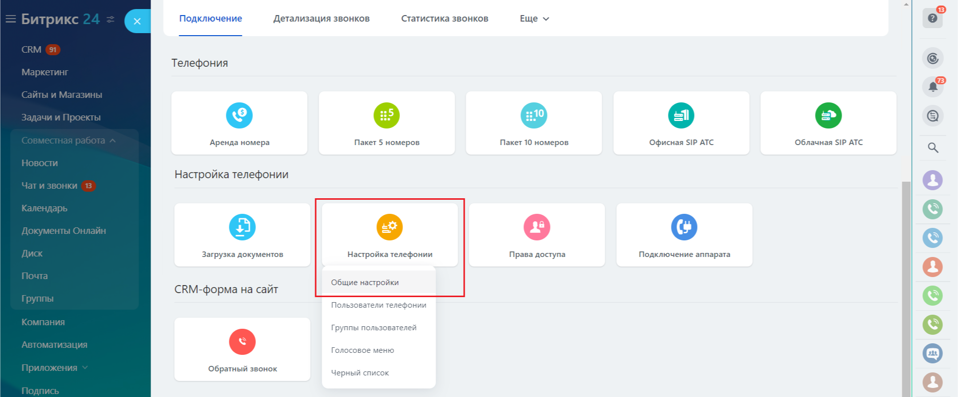 8. В поисковой строке Битрикс24 наберите «Телефония» и перейдите в этот пункт меню. На новой странице найдите блок «Настройка телефонии». Кликните по нему левой кнопкой мыши и выберите «Общие настройки».
