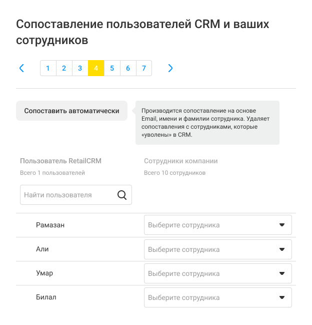 3. На первом шаге настройки интеграции сопоставьте всех пользователей АТС с пользователями Битрикс24. Это необходимо, чтобы системы могли однозначно идентифицировать сотрудников и правильно отражать связанные с ними события. В Битрикс24 будут заноситься звонки только сопоставленных пользователей. Если в будущем вы добавите новых сотрудников, не забудьте сделать сопоставление в настройках интеграции из личного кабинета АТС.