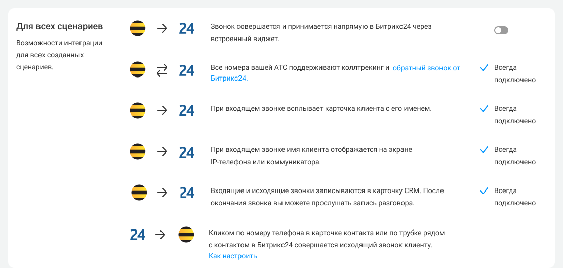 - чтобы управлять звонками прямо в интерфейсе Битрикс24, сдвиньте переключатель вправо в первом сценарии этого блока – «Звонок совершается и принимается напрямую из Битрикс24 через встроенный виджет». Подробнее о звонках через виджет Битрикс24 читайте в статье «Звонки из Битрикс24 (WebRTC)».