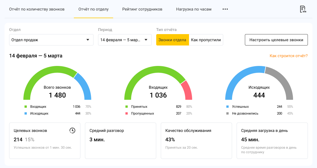 В сводке по всем звонкам можно отслеживать количество звонков, качество обслуживания и средние показатели как по отделу в целом, так и по каждому сотруднику отдела. Также вы можете задать длительность целевых звонков, чтобы оценивать, какая доля вызовов соответствует KPI. Подробнее о том, какие задачи поможет решить этот отчет, — в статье Возможности отчета «Звонки отдела».