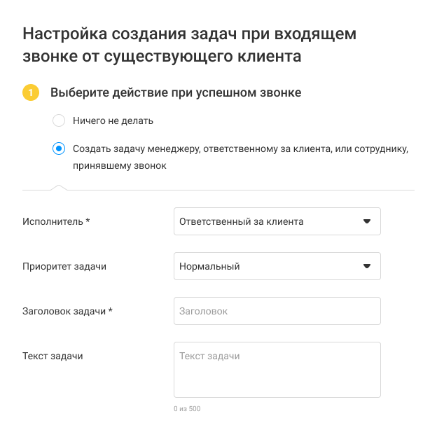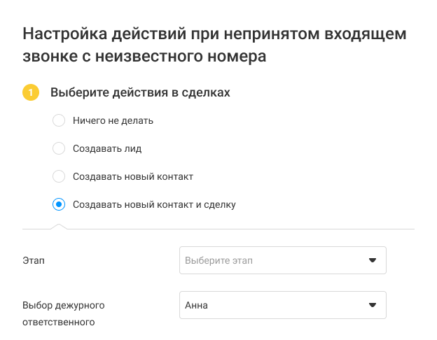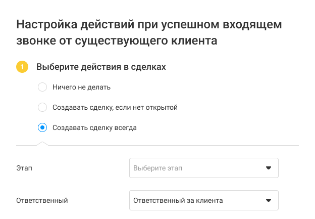 Например, если звонок поступил от существующего клиента, то ответственным за сделку и задачу может быть назначен сотрудник, принявший звонок, либо ответственный за контакт.