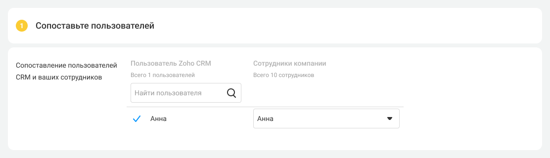 3. Сопоставьте всех пользователей АТС с пользователями Zoho, чтобы системы могли правильно отражать связанные с ними события. В Zoho CRM будут заноситься звонки только сопоставленных пользователей. При добавлении новых сотрудников в будущем тоже необходимо будет их сопоставить.