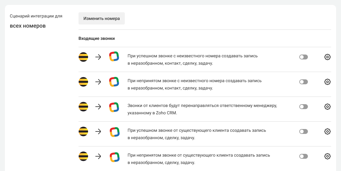 4. Вы можете настроить интеграцию для всех номеров сразу (этот вариант выбран по умолчанию) или для каждого в отдельности. Подробности — в статье «Настройка нескольких сценариев интеграции с CRM».